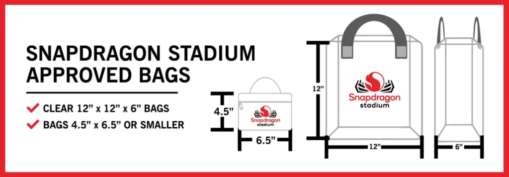 Snapdragon Stadium is a clear bag only venue. Guests are encouraged to limit the number of items they bring with them to the stadium. Only (1) one of the following style and size bag, package, or container per person: